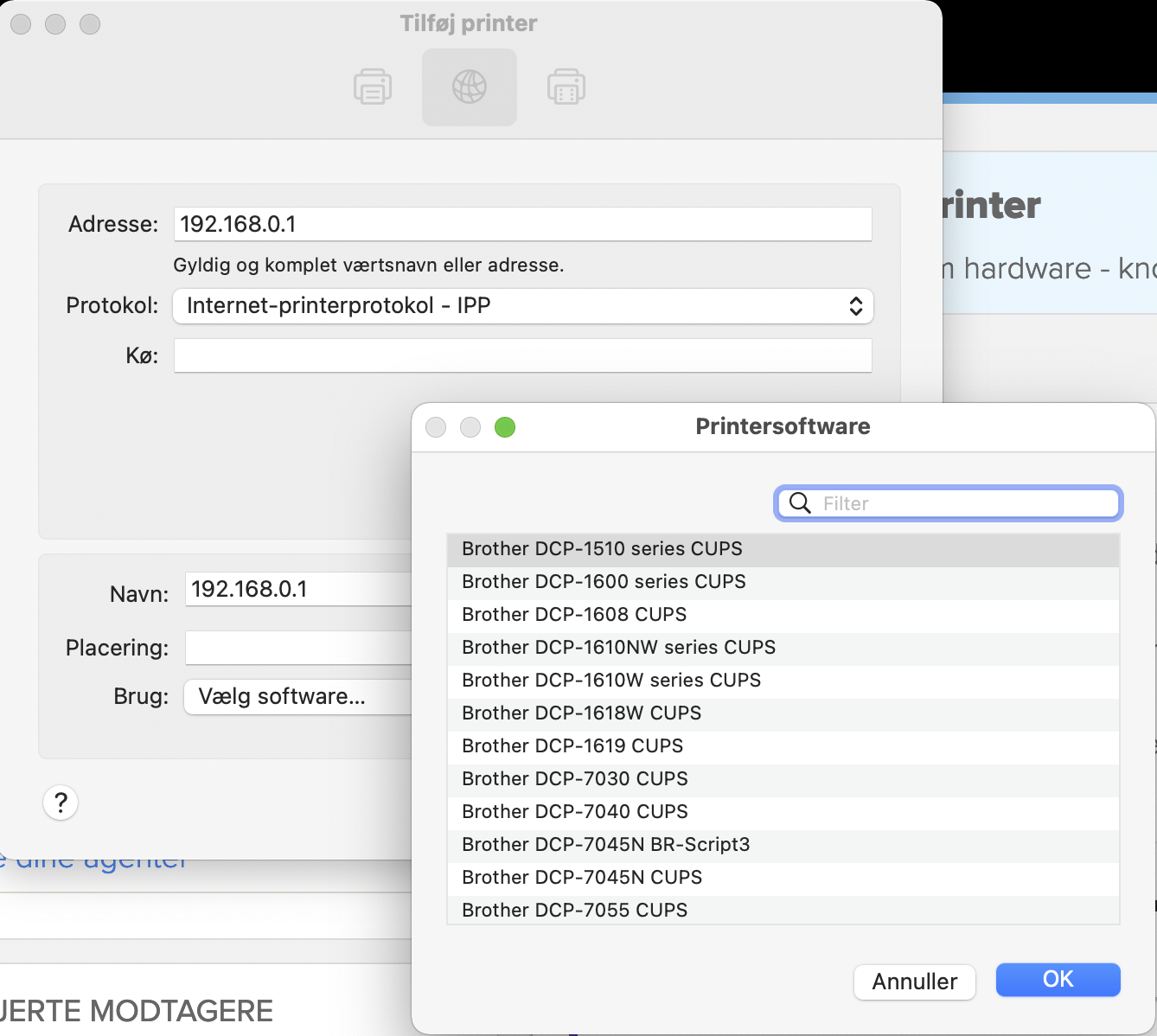 Bare for at forstå hvilken list du snakker om. Er det tilføj printer->brug->vælg software? (bliver først aktiv når du har valgt printer-adresse f.eks ip-adresse.