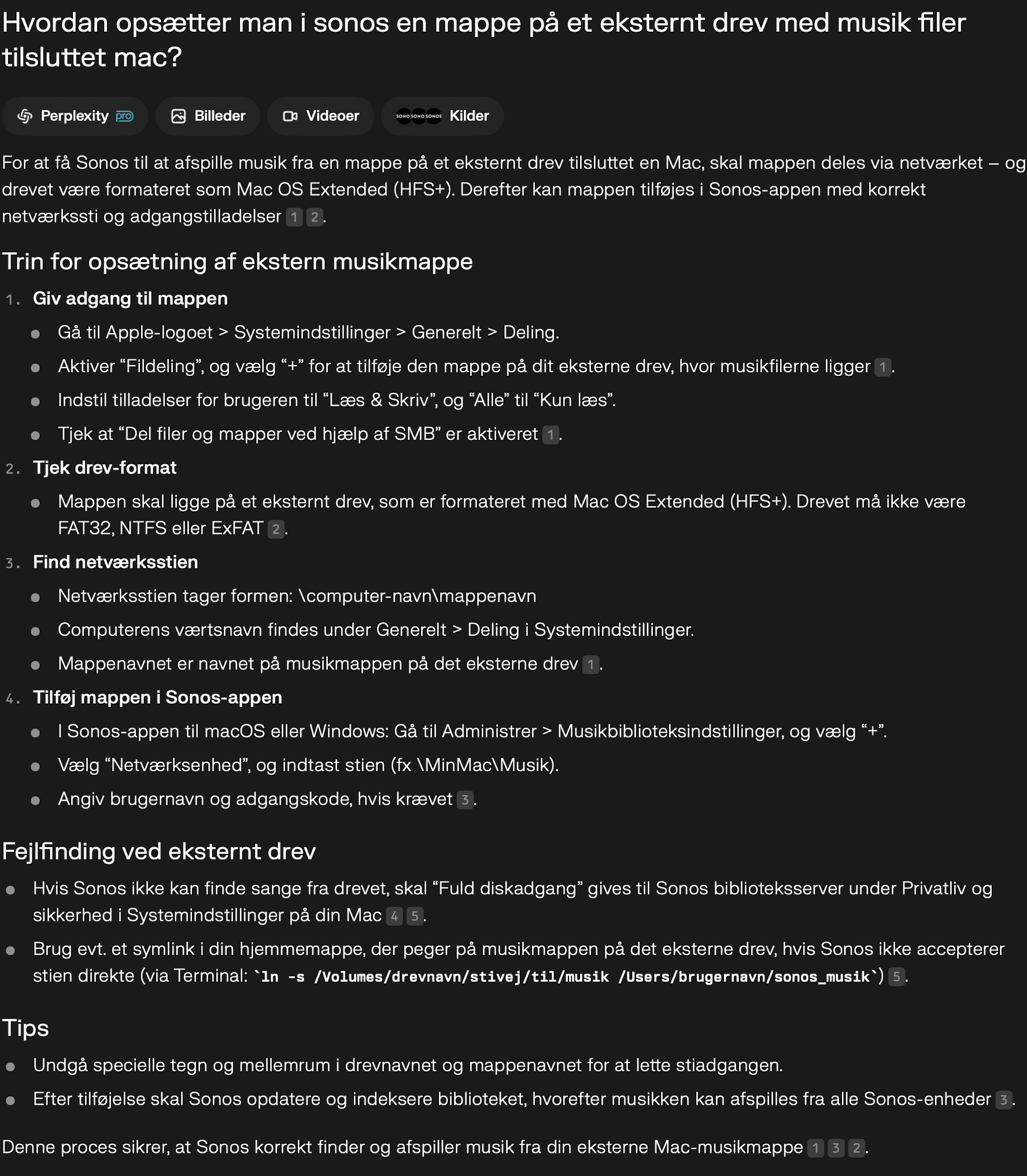 MichaelCorfitsen skrev:Hej PallMei. Det du har fundet er det Sonos også skriver og som jeg har udført sammen med såvel Sonos som Apple - og som jeg altid har gjort og som har virket i små 10 år. Jeg har blot været over en ændring af mappenavn fra "C. Musik MC" til "C. Musik (1TB / 16TB)" og tilbage igen til "C. Musik MC" - klart min fejl. Herefter virkede den "klassiske" opsætning ikke.