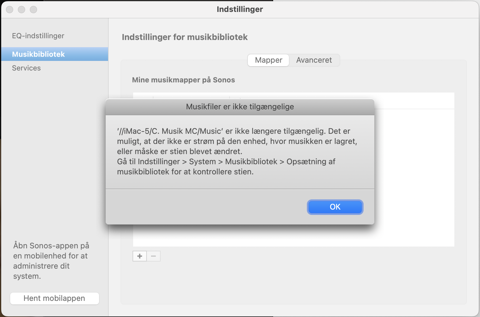 Hej derude. Så er det sket igen. Af andre årsager fik jeg omdøbt det externe drev mit musikbibliotek ligger på fra "C. Musik MC" til "C. Musik (1TB / 6TB)". Sonos S2 kan nu ikke få forbindelse til mit musikbibliotek - som indtil min dumme ændring virkede upåklageligt. Sidst jeg havde et problem (november 2024) fik jeg det løst, men samme løsning virker ikke nu.