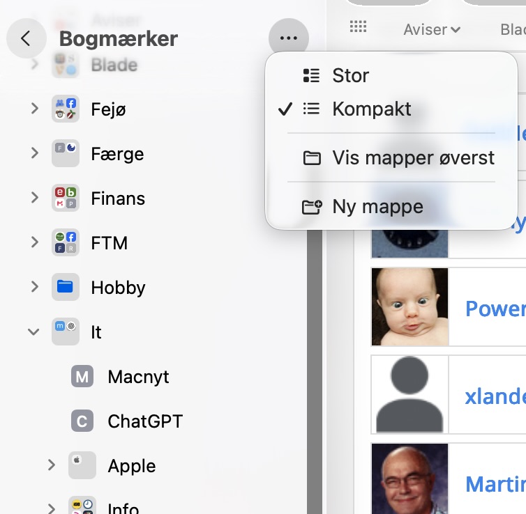Jeg har ikke de 3 prikker. Det jeg ønsker er, at oversigten ser ud som billed 3, men at alle Bogmærker er øverst og alle Mapper er nederst