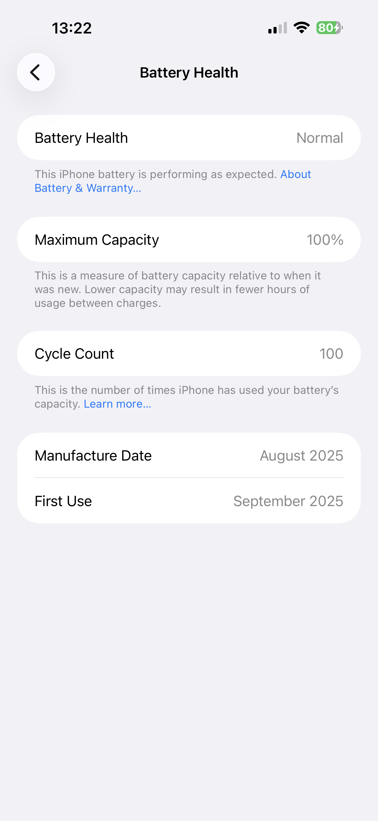 Resultatet er 100 cyklusser og stadig normalt batterihelbred og maks kapacitet på 100%. Det er godkendt, Apple.