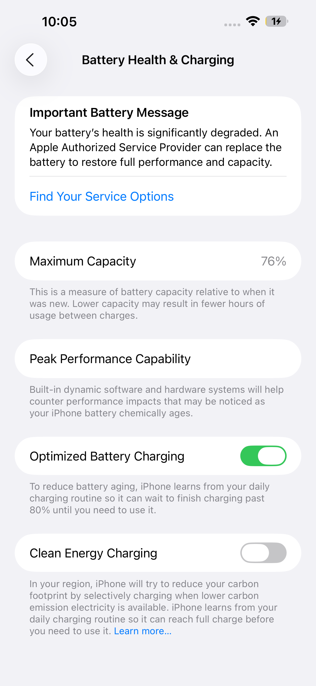 Jeg har ikke clean energi, men om det er pga. model eller sprog ved jeg ikke. Jeg mente også, at man på nyere kunne sætte en grænse for, hvornår opladningen skulle stoppe. Men det ser ikke ud til på det skærmbillede, eller også kræver det en nyere model end 14. 🤔